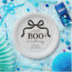 This design features Halloween baby shower theme "A Little Boo Is On The Way" with black bow and spooky spiders webs and spiders and flying bats to give it a cute but spooky Halloween vibe. Perfect for gender neutral baby shower in grey and black colors.