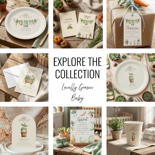 Our farmers market locally grown baby shower paper plates include a sweet baby in a plant pot wearing a leafy hat.