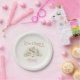 Storybook baby shower paper plates with vintage books and watercolor floral design create a beautifully coordinated table setting for a “New Chapter Begins” celebration. Featuring soft muted blush and sage tones, this round baby shower plate design showcases a charming stack of classic books topped with a sweet baby accent, surrounded by delicate botanical greenery and airy florals for a timeless literary theme. The elegant combination of graceful script and refined serif typography enhances the romantic, storybook inspired aesthetic, making these baby shower party plates perfect for a book themed baby shower, vintage baby shower, or garden style celebration. The soft neutral background allows the watercolor artwork and subtle pink lettering to stand out while maintaining a cohesive and sophisticated look that pairs effortlessly with matching invitations, enclosure cards, and décor. Ideal for baby girl showers or feminine literary themes, this custom baby shower plate design adds a charming focal point to dessert tables, cake displays, and place settings. With its classic botanical accents and sentimental book motif, this storybook baby shower party plate design brings warmth, elegance, and cohesive style to your celebration décor.