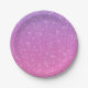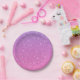 A round plate with a gradient from purple to pink, featuring a textured glitter-like finish. The plate is shown in front and angled views on a neutral background.