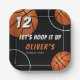 Agarra las Placas de papel de cumpleaños de los niños deportivos de baloncesto. El diseño tiene un divertido texto "Vamos a colgarlo" y pelotas de baloncesto sobre un fondo negro. Añade tu nombre y edad. Excelentes platos para una fiesta de cumpleaños con el tema del baloncesto.