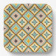 Abstract geometric pattern with diamond shapes in pastel colors. Each contains a star-like motif in teal, orange, or brown. Retro and symmetrical design.