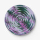 Los platos fiestas Bonitos presentan un patrón geométrico girado en tonos violetas y verdes. El patrón se parece un poco a algunos estilos de tintado. Perfecto para una fiesta de aniversario o cumpleaños.