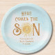 Estas placas de papel para bebé de este lindo niño presentan el texto "Here Comes The Son" en una tipografía elegante con un sol de color amarillo y azul sonriente y color amarillo. Personalizable fácil. Porque creamos nuestra obra de arte no encontrarás esta imagen exacta de otros diseñadores. Acuarela original © Michele Davies.
