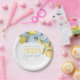 Elegantes y Dulces Limón Blanco Ella Ha Encontrado Sus Platos de Papel Main Squeeze Personalizados. Personalice con el nombre de la novia. Con hermosas flores de acuarela azul pizarra elegante y dulces limones amarillos.