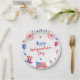Artículos patrióticos representados en un efecto acuarela rodean esta placa de papel fiesta del 4 de julio. Un cartel rojo, blanco y azul cuelga de arriba, mientras que un patrón de estrella crea un fondo de celebración. Celebrar con amigos y familia en un fiesta del Día de la Independencia, exhibición de fuegos artificiales, barbacoa o evento comunitario. Disponible con productos a juego.