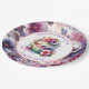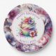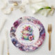 Bonito repostería vintage chic y con flores rosadas y violetas sobre platos de papel de cumpleaños personalizados.