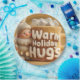 A charming and sweet 3D render or miniature photograph featuring an adorable, fluffy beige felt gnome standing next to a large, textured fabric mug. The gnome has a large white beard, pink cheeks, and a beige knitted hat. The oversized mug is labeled with the message "Warm Holiday Hugs" in white, marshmallow-like letters, and is overflowing with soft white marshmallows. The scene is set against a warm, soft ochre background, emphasizing the cozy, comforting, and whimsical nature of the image.