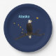 Un águila calva dispara el cielo desde su posición sobre una rama de árbol; superpuesto sobre una bandera de Alaska. El texto que dice "Alaska" también aparece en azul brillante y blanco. Traigan esto para su picnic del Día de Alaska.