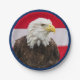 Una maravillosa imagen de un águila calva posando frente a una bandera estadounidense.