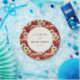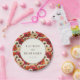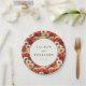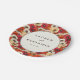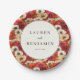 Este plato de boda presenta un vibrante patrón floral con amapolas densamente empaquetadas en tonos de rojo intenso, rosa suave, blanco cremoso y centros amarillos, creando un fondo animado y colorido. El diseño incluye un círculo blanco central bordeado por una delgada línea negra, donde una tipografía elegante muestra los nombres y la fecha en fuentes serif y sans-serif contrastantes. El estilo de representación semi-realista captura detalles esenciales mientras mantiene una apariencia estilizada, transmitiendo un ambiente alegre y festivo perfecto para celebrar ocasiones especiales como bodas.