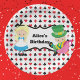 Cute Alicia en los platos de la fiesta de cumpleaños temática del país de las maravillas. La niña pequeña Alice con su vestido azul y el sombrerero loco se sientan encima de un patrón de barajas en rojo y negro con espadas y símbolos de diamante. Personalizar con su propio texto.