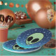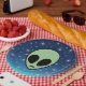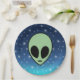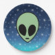 Una cabeza extraterrestre verde con grandes ojos ovalados negros y una pequeña hendidura negra para una boca. El fondo es de color degradado de color oscuro a azul claro, salpicado de estrellas blancas.