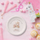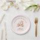 Plato de papel elegante para despedida de soltera con ilustración de tetera y tazas de té pastel con acentos dorados, combinado con fuentes serif y script en las que se escribe la información personalizada. Revisa nuestra tienda para ver más artículos de esta colección.
