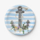 ancla gris y cuerda blanca con ramo de flores sobre fondo de color de rayas azules y blancas