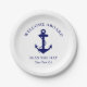 Platos modernos de papel de temática náutica para tu barco que cuentan con un ilustracion azul marino de un ancla, y "Welcome Aboard" y el nombre y ubicación de tu barco en una elegante tipografía y escritura azul marino.