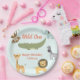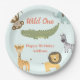 Celebra el primer cumpleaños de tu hijo con este plato de papel de primer cumpleaños de animales salvajes de un Safari africano. Incluye animales salvajes pero lindos africanos celebrando el primer cumpleaños de tu hijo. Un mono, cocodrilo, elefante, cebra, jirafa y león harán sonreír a todos. Ilustrado con un pacífico color pastel, con la audaz tipografía "Wild One", este único plato de fiesta de cumpleaños es perfecto para niños y chicas y fiesta de cumpleaños con temática de safari neutral de género.