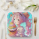 Placas de papel de fiesta de cumpleaños. Bonito púrpura y rosa de bizcocho de anime giran el arte caprichoso en púrpura, rosa, azul y amarillo.