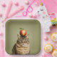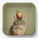 Un gato gracioso con una manzana balanceándose encima de su cabeza.
