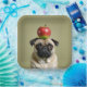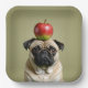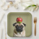 Gracioso Pug con una manzana balanceándose encima de su cabeza.