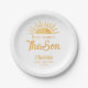 Decoren la ducha de bebé de su chico con temática solar con estos adorables platos de papel. Presentan el texto "Here Comes The Son" en una tipografía elegante con un sol de color amarillo. Personalizable fácil. Acuarela original © Michele Davies.