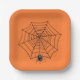 Gran araña negra con ojos brillantes en telaraña sobre fondo naranja. Se puede cambiar el color de fondo.