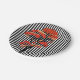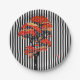 Árbol rojo de flores de IA sobre franja vertical blanca y negra. Flores de ai rojas, naranjas, doradas y amarillas en el tronco de un árbol negro con silueta y ramas con algunas flores caídas, todo contra rayas verticales contemporáneas en blanco y negro hace que este plato de papel festivo sea llamativo y dramático. Si lo desea, puede personalizar modificando o agregando imágenes, texto o colores de fondo para hacerlo único suyo. Busque la coordinación de la decoración de la casa de personalizable y los productos de cocina y comedor en nuestra tienda.