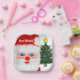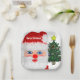 Feliz Navidad está escrito en una tipografía blanca festiva a través del gorra peludo rojo blanco de Santa. Jolly Santa Claus con mejillas rosadas, ojos azules, barba blanca, nariz roja grande y gorra peludo blanco rojo. Árbol navideño de fondo adornado con pan de jengibre, caramelos, adornos y estrella amarilla encima. Obra de arte original © 2013, 2015 TamiraZDesigns.