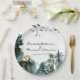 Este elegante plato inspirado en la naturaleza presenta una escena del bosque del noroeste del Pacífico en un estilo de pintura acuarela. La imagen muestra pájaros volando en la parte superior, por encima de dos nombres de muestra y fecha de boda. La parte inferior cuenta con un bosque de pinos de color acuático y un alce.