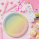 Un arcoiris lleno de colores pastel decora este conjunto de platos de papel. Colores rosas, verdes, azules, amarillos, violetas... También disponible en servilletas a juego y accesorios de cocina. Ideal para un picnic en un hermoso día.