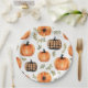 Placa de papel de armería de cosecha Una mesa encantadora de otoño con una mezcla de calabazas en tonos cálidos y tierra. El diseño combina los clásicos calabazas naranjas con unos llamativos estampados de yeso, enclavados en un delicado follaje verde y marrón. La composición evoca el acogedor espíritu del otoño, ideal para celebrar la belleza natural y el ambiente festivo de la temporada.