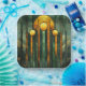 Hermosas placas de papel vintage art déco con un patrón geométrico en tonos de verde, turquesa y dorado. La imagen representa el sol naciente y rascacielos altos de la ciudad.