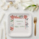 Presenta un diseño de primavera floral de arte popular en salmón oscuro, verde, azul y violeta. Este plato de papel coincide con la invitación de ducha del mismo diseño.