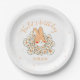 Mignon lapin entouré d'élégantes fleurs pour la fête d'anniversaire et le baby shower de votre enfant. Assiette carton personnalisée avec le nom de votre enfant. Dessin d'un petit lapin entouré de fleurs. Produit faisant partie d'une collection.