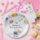 Haz que los niños de este planeta galaxia tengan placas de papel fiesta de primer cumpleaños para la fiesta de cumpleaños del tema del espacio exterior de tu hijo. Ilustracion de planetas y cohetes de acuarela. El texto debajo dice "Primer cumpleaños de Hannah". Añada el nombre de sus hijos aquí para personalizar el diseño.