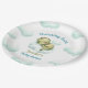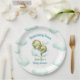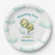 Los modernos platos de papel para bebés con un lindo dinosaurio bebé en las nubes en azul y verde. Personaliza fácilmente el texto. - Kate Eden Art