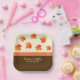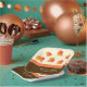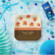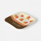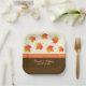 Placas de papel para un boda de otoño con hojas de arce brillantemente coloreadas, una cinta de plástico y un fondo marrón. Una manera de servir tartas de temporada en la recepción. Incluya los nombres de la novia y del novio y la fecha del boda.