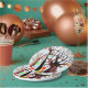 Esta imagen está diseñada como un día de otoño con la nieve cayendo. Los árboles están perdiendo sus hojas y los pavos están sentados sobre sus verduras y frutas. Estas placas de papel están disponibles en 2 tamaños diferentes.