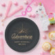 Placas personalizadas de papel de cumpleaños con un ilustracion de color dorado sobre un fondo gris negro. Diseñado con un ilustracion de montaña con los rayos de sol brillando hacia afuera desde atrás. La tipografía dice: "Aventura explorar el descubrimiento de los sueños".