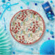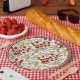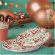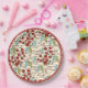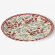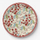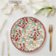 Este plato de papel presenta un bonito diseño original de un rebaño de aves de color verde aguacate y azul óvulo de robin sentadas juntas en cómodos pares sobre delgadas ramas cubiertas con brotes de jugosas bayas rojas de arándanos en un campo de color crema, bordeado por un rojo oscuro y crema.