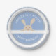 Azul claro, redondeado con borde blanco y marrón, adornado con entramado blanco. La cabeza, la cara y las patas de un conejo marrón se aferran a una cinta blanca debajo. Los textos de plantilla a la derecha le permiten personalizar para uso personal. Ideal para fiestas de cumpleaños para niños o un evento de Pascua.