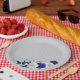platos de papel gris azul real y flores blancas
