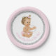 Purpurina rosa y plateado con placas de papel para bebés con adorables bebés con pantalones de rufa rosados y una cuerda de perlas en un fondo purpurina rosa y plateado. Estas placas de papel para bebé chicas adorables se pueden personalizar con texto en el estilo de letra y color de su elección. También puede cambiar el color de fondo. Este es un diseño impreso sin perlas reales, purpurina, etc.