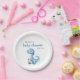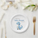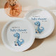 Estas lindas placas de papel para bebés presentan un dinosaurio color azul bajo las palabras "ducha de bebé" en la impresión de manos azules. Personalice el texto con el nombre de la futura madre y la fecha en el tipo de letra de sans serif gris carbón.