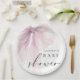 Completa el tema sofisticado de tu fiesta con estos elegantes platos de papel personalizados para baby shower. El diseño presenta el lazo de acuarela etérea característico de la colección en un tono rosa pálido, sobre un fondo blanco. Personaliza fácilmente el texto con el nombre de la madre, lo que lo convierte en un complemento perfecto para la decoración de tu baby shower de niña. Estos platos son un detalle esencial para una hermosa y cohesionada decoración de mesa.