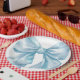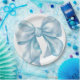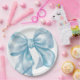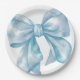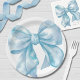 Un encantador diseño de plato de papel con un gran lazo azul acuarela en el centro. Este diseño simple, minimalista y elegante es perfecto para una fiesta de bebé para niño, un tema de fiesta de compromiso como "Ella está atando el nudo", o una celebración de "Algo azul antes de hacerlo", así como otros temas de fiesta lindos.
