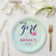Este adorable plato de papel de bebé de temática oceánica muestra una encantadora combinación de rosa fucsia y azul marino. La tipografía azul marino explica en detalle "niña bebé", mientras una deliciosa ballena rosa picante de fucsia roce alegremente los corazones sobre un tranquilo fondo azul pálido. Para añadir un toque personal, el plato también incluye el nombre de la futura madre, lo que lo convierte en un complemento perfecto para cualquier celebración de una ducha de bebé.