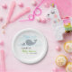Este plato de papel para bebé ofrece un diseño limpio y blanco con una imagen de una ballena madre y su ballena bebé. El conjunto es muy limpio y minimalista. El texto del personalizable te permite añadir el nombre de la futura madre y la fecha de su ducha.