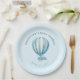 Celebre la fiesta de cumpleaños de su hijo o el fiesta de la ducha de bebé con estas placas fiestas que presentan un lindo globo de aire caliente azul acuático y ilustracion en la nube sobre un fondo azul para un tema de viaje.
