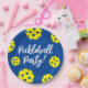 Baloncesto Platos de fiesta de cumpleaños (desechables). Diseño divertido con reunión con amigos y familia. Personaliza tu texto. Fondo azul y bolas amarillas. También es ideal para torneos, eventos de club, fiestas de partidos, celebraciones, reuniones, barbacoa, día infantil y más.